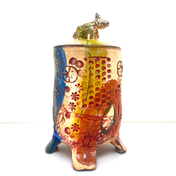 This is a soda fired earthenware jar. There is a stamped and stained exterior surface. And it sits on 4 pedestal feet. It has a porcelain slip and underglazes on the exterior.