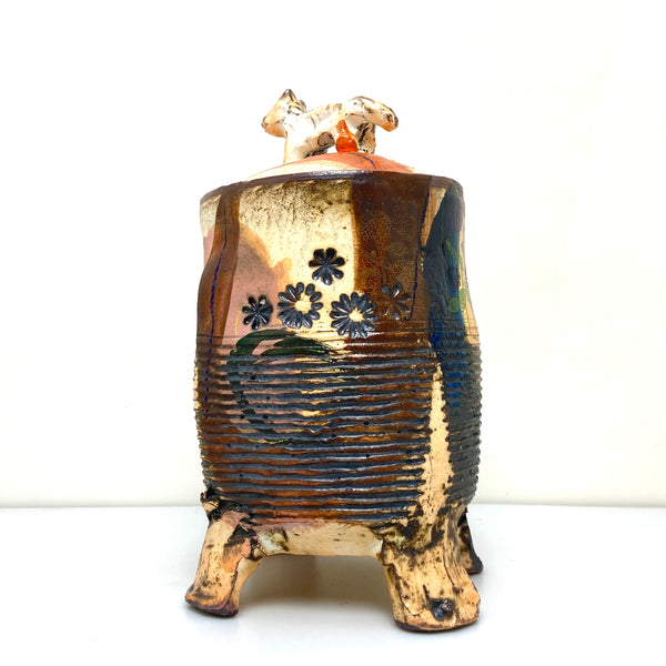 This is a soda fired earthenware jar. There is a stamped and stained exterior surface. And it sits on 4 pedestal feet. It has a porcelain slip and underglazes on the exterior.