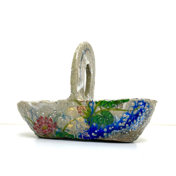 This is a soda fired earthenware tray with a rainbow shaped handle. It has a porcelain slip on the exterior. Perfect for pistachios, or other snacking needs.