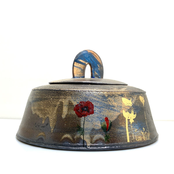 This is a soda fired earthenware jar with a rainbow shaped lid handle. It has a porcelain slip and rutile stain on the exterior. It is decorated with poppy decals.