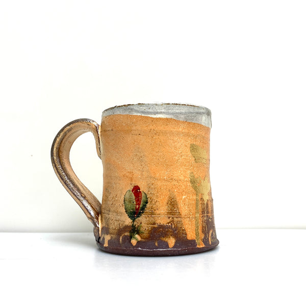 This is a soda fired earthenware cup. It has a porcelain slip and poppy decals on the exterior.