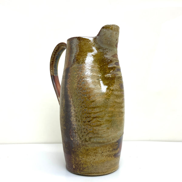 This is a wood fired stoneware pitcher with a porcelain slip and glaze. This piece was fired for 30 hours using native hardwoods collected from the land where I live.