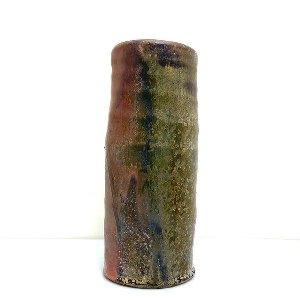 This is a wood fired stoneware vase with a porcelain slip and glaze. This piece was fired for 30 hours using native hardwoods collected from the land where I live.